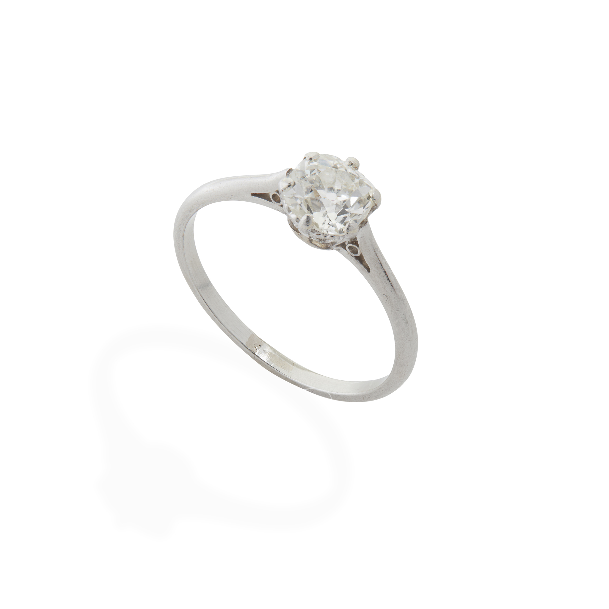 Claw-set with an old round-cut diamond, weighing approximately 0.80cts, plain band, unmarked