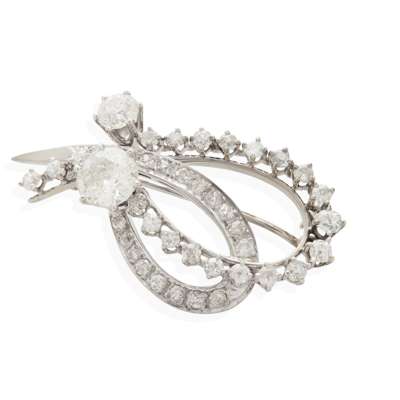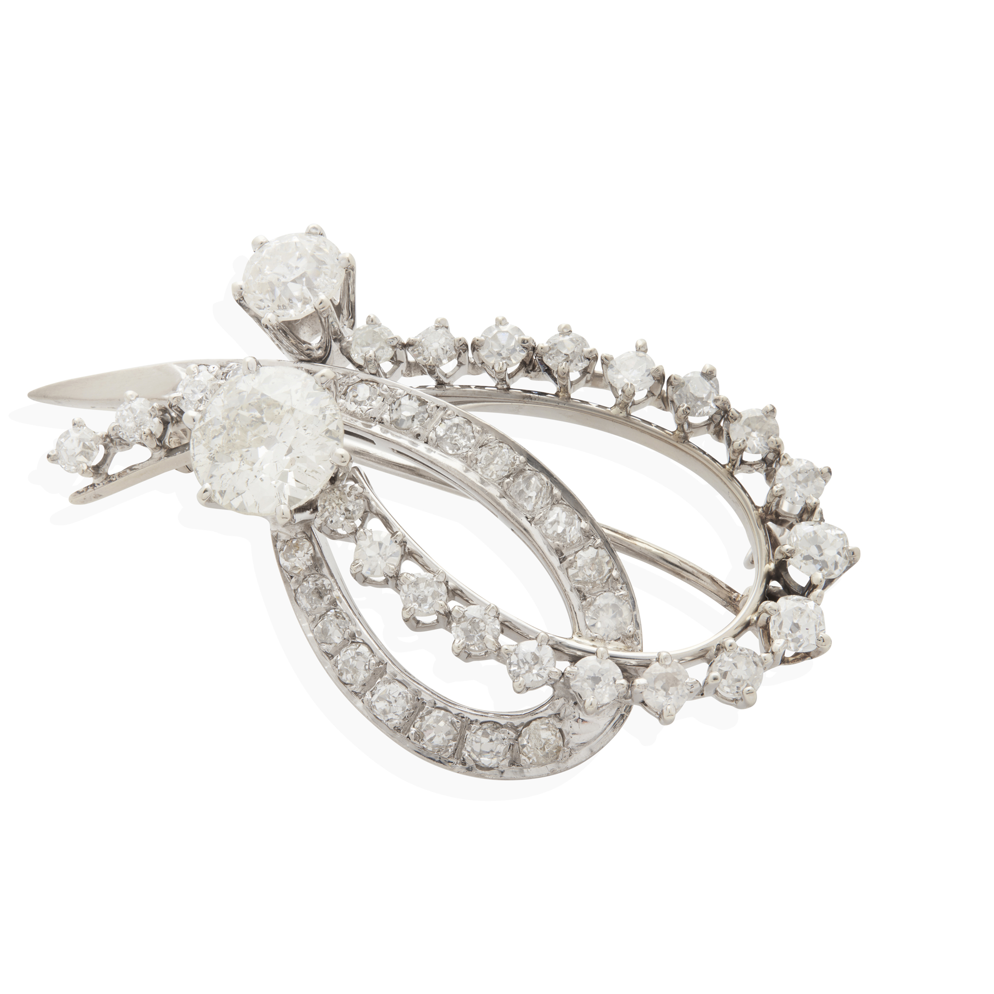Of scrolling design, claw-set throughout with graduated old round-cut diamonds, the principal diamond weighing approximately 1.40cts, stamped 750