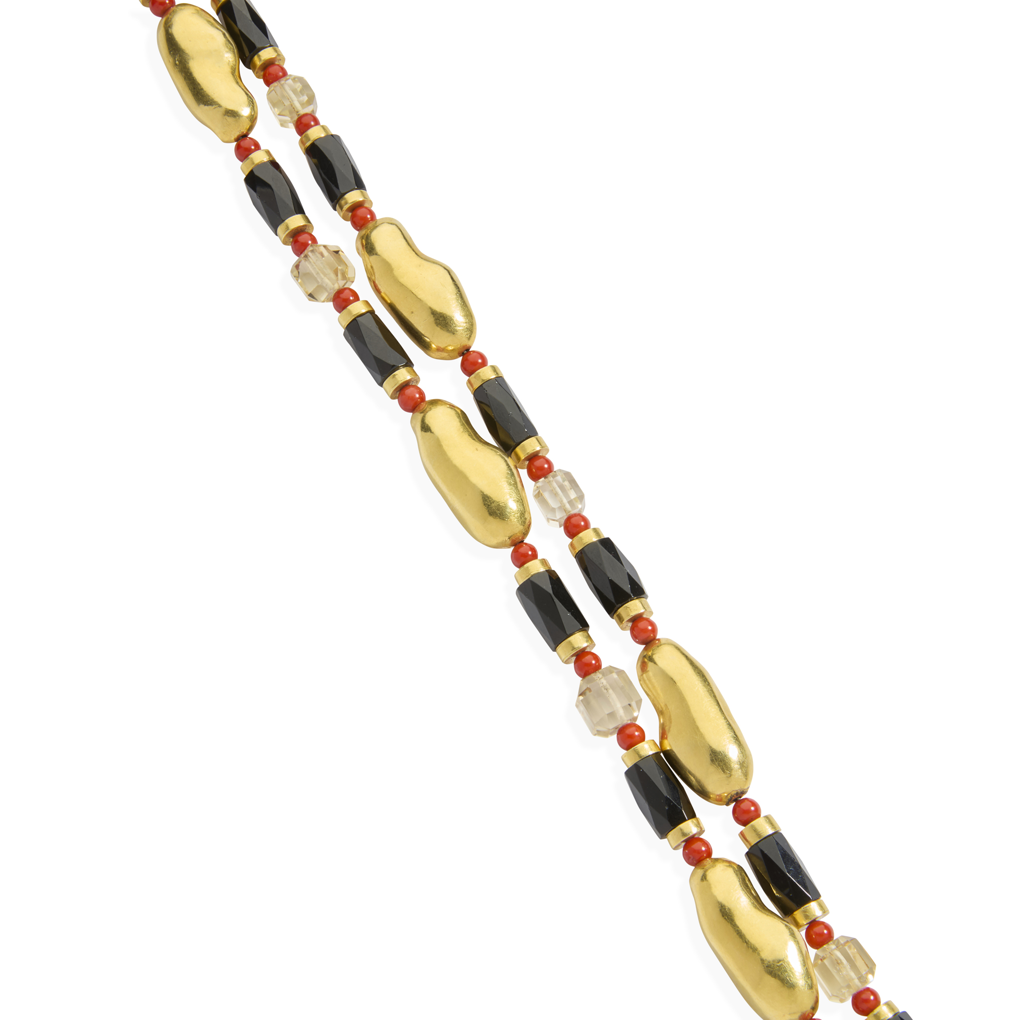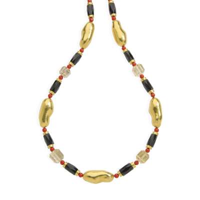 Composed of facetted onyx cylinders, coral beads, facetted rock-crystal square beads and polished amorphous yellow metal beads, to a hook clasp, unmarked