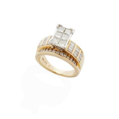Set with a rectangular cluster of six princess-cut diamonds, the shoulders set with baguette-cut and round brilliant-cut diamonds, plain band, stamped 14K
