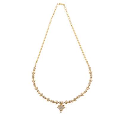 Claw-set with clusters of small round brilliant-cut diamonds, suspending a tapered diamond-set pendant, flattened-link chain, indistinctly marked