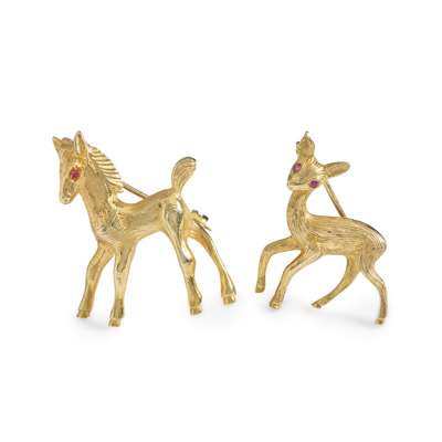 One modelled as a fawn and the other as a foal, both with textured detail to their body, set with a small round-cut ruby eye; UK hallmark