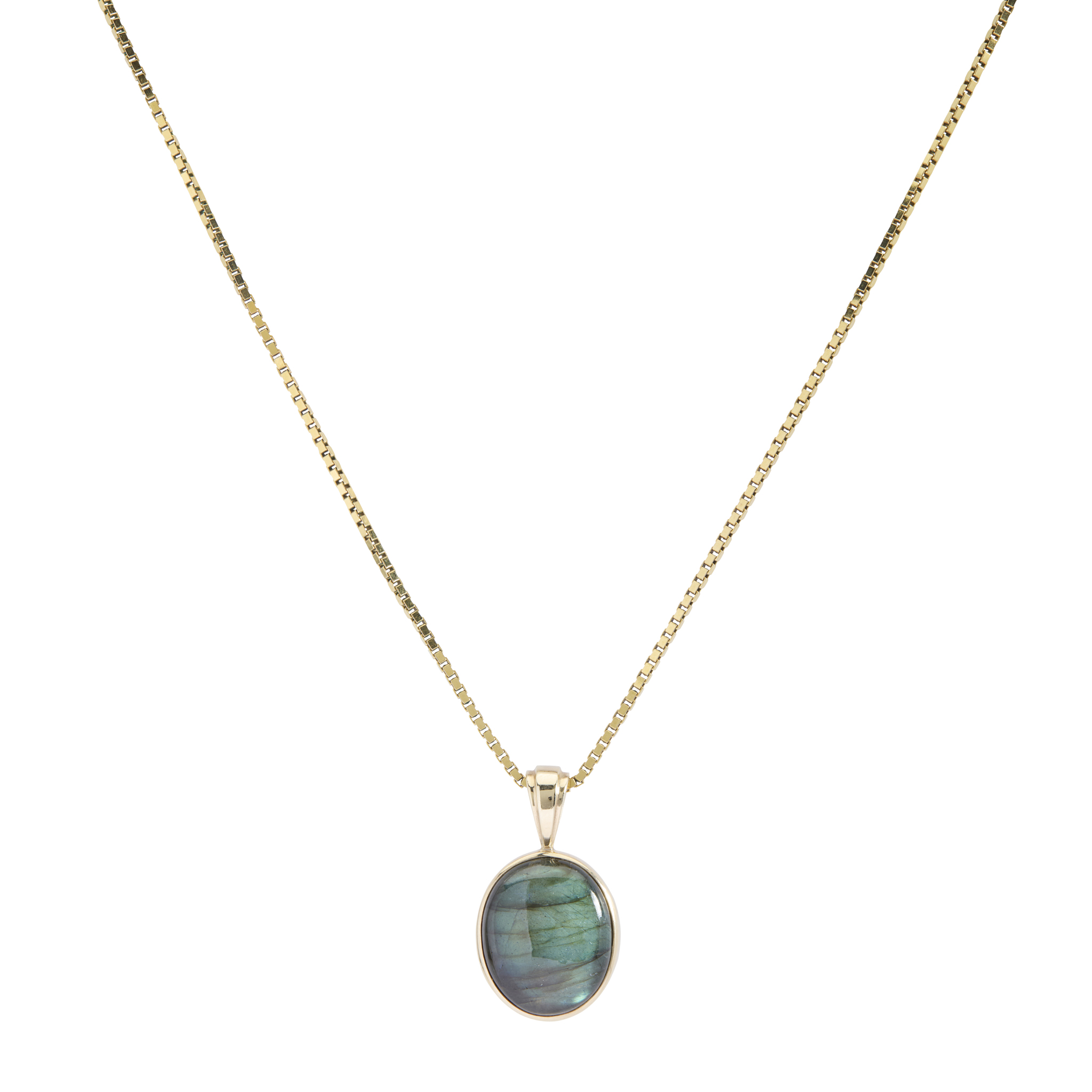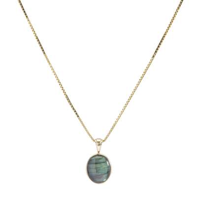 Collet-set with an oval cabochon labradorite, to a box-link chain, UK hallmark