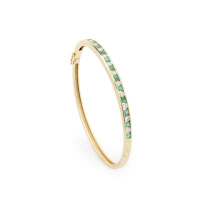 Of hinged design, the front channel-set with alternating square step-cut emeralds and round brilliant-cut diamonds, stamped 750