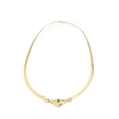 Collet-set with a pear-shaped emerald in a border of round brilliant-cut diamonds, to a flattened-link chain, stamped 750