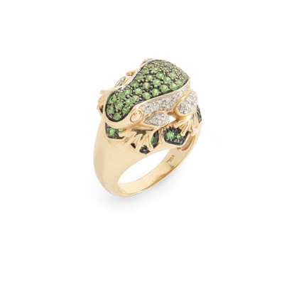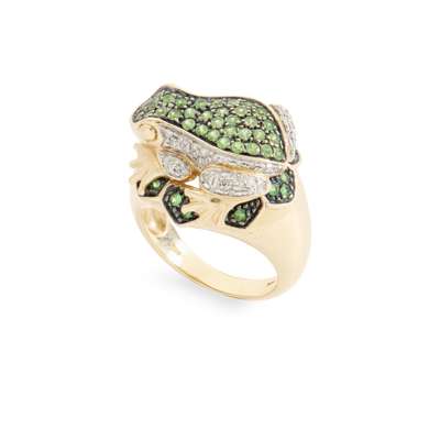 Modelled as a frog seated on a lily pad, pavé-set throughout with round-cut demantoid garnets and diamonds, plain band, stamped 14k