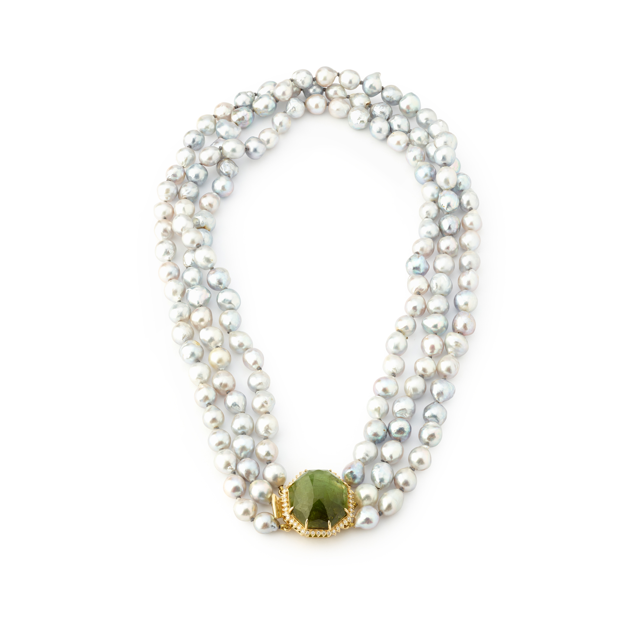 Composed of three strands of grey baroque pearls, the clasp set with an octagonal mixed-cut green tourmaline in a border of round brilliant-cut diamonds, stamped Au750
