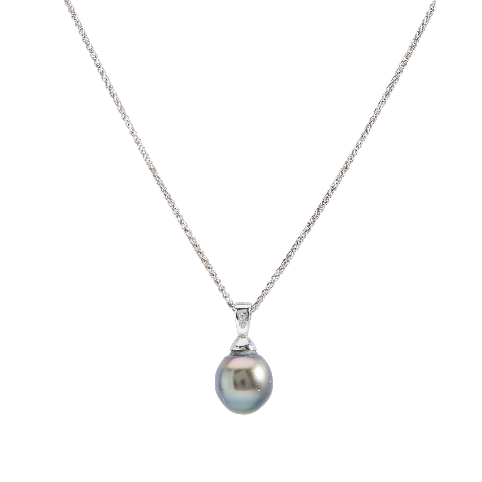 Set with a single ovoid Tahitian pearl, trace-link chain, UK hallmark