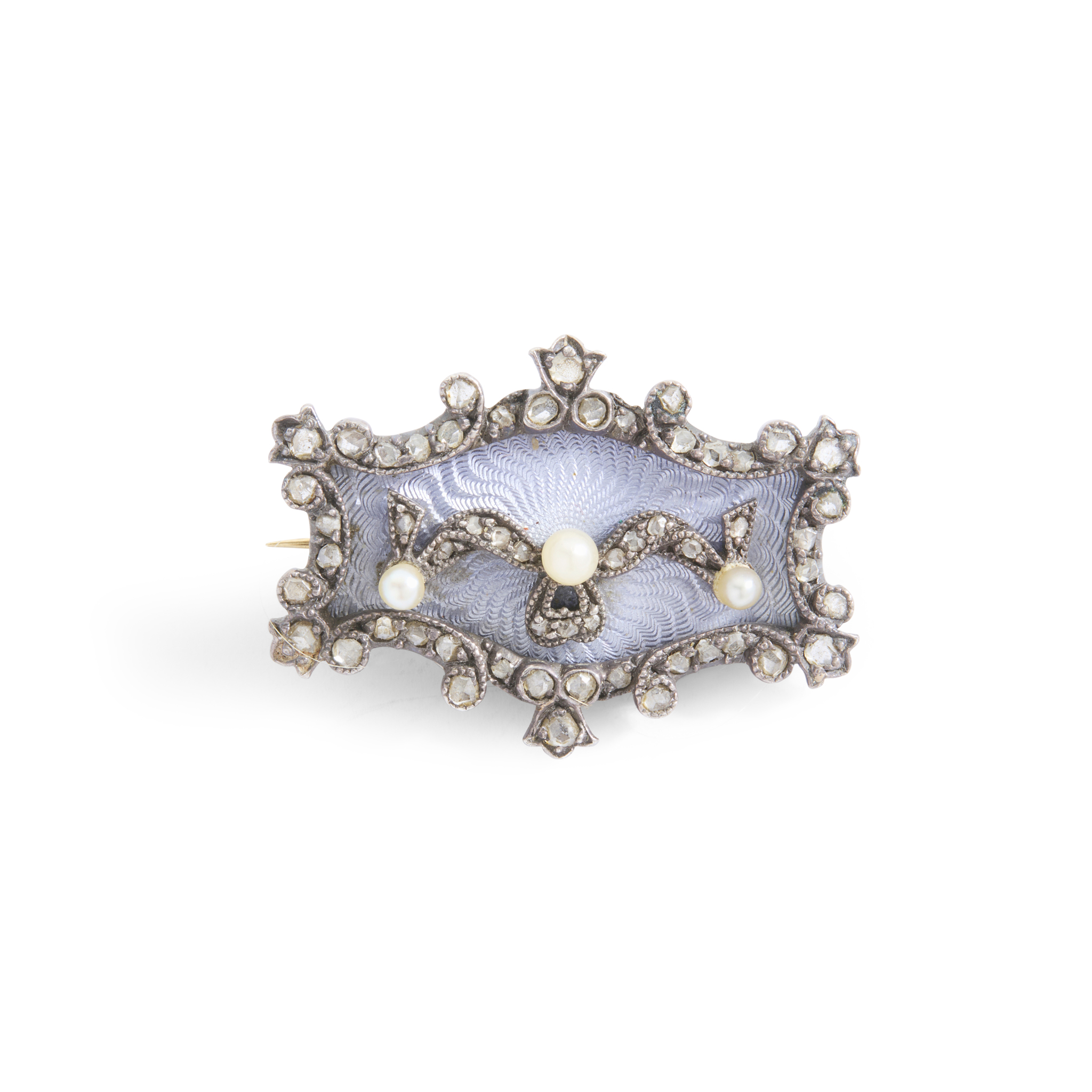 A late 19th century enamel, pearl and diamond brooch, circa 1880s