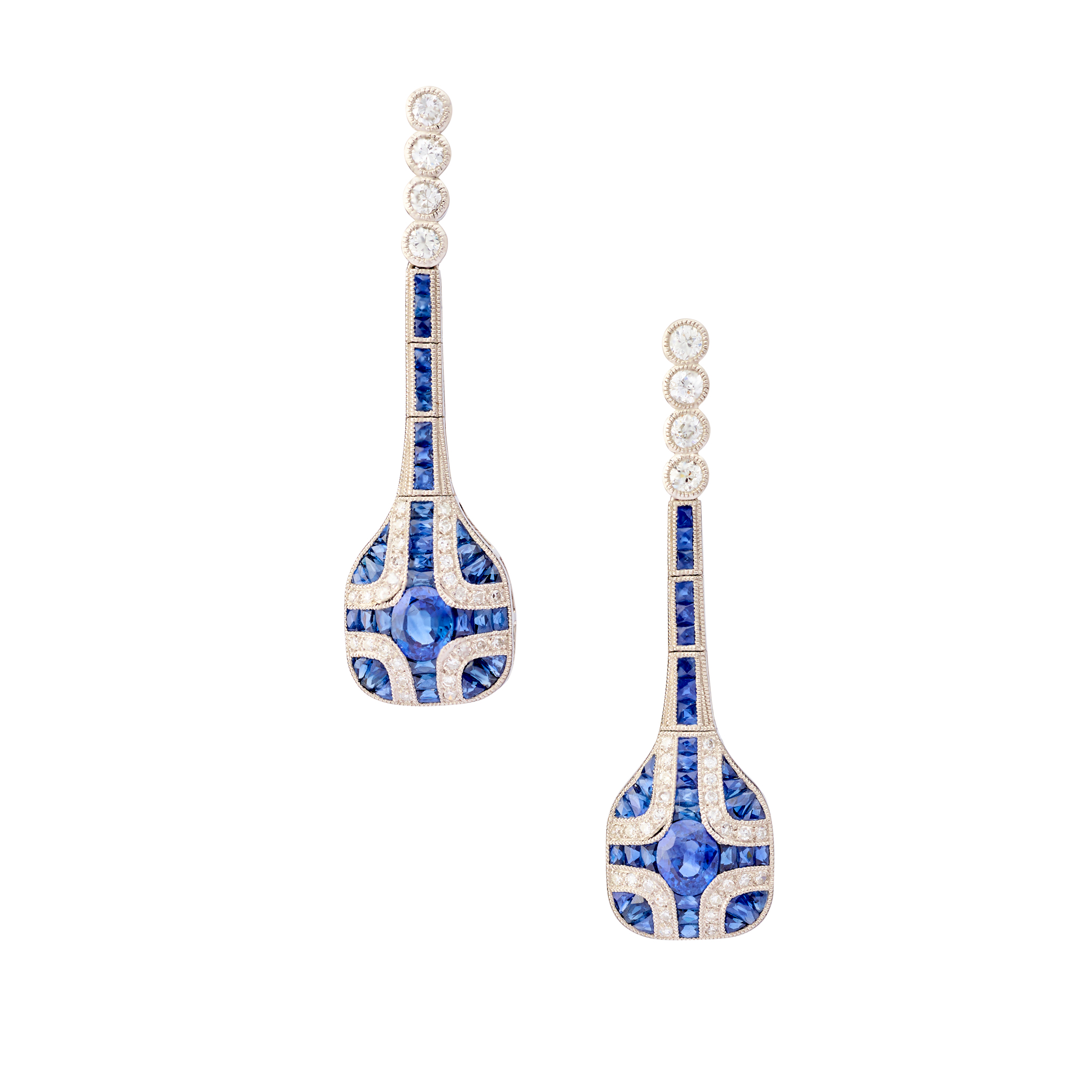 Each of tapering design, set with oval and calibré-cut sapphires and round brilliant and eight-cut diamond detail, post and clip fittings, stamped PLAT