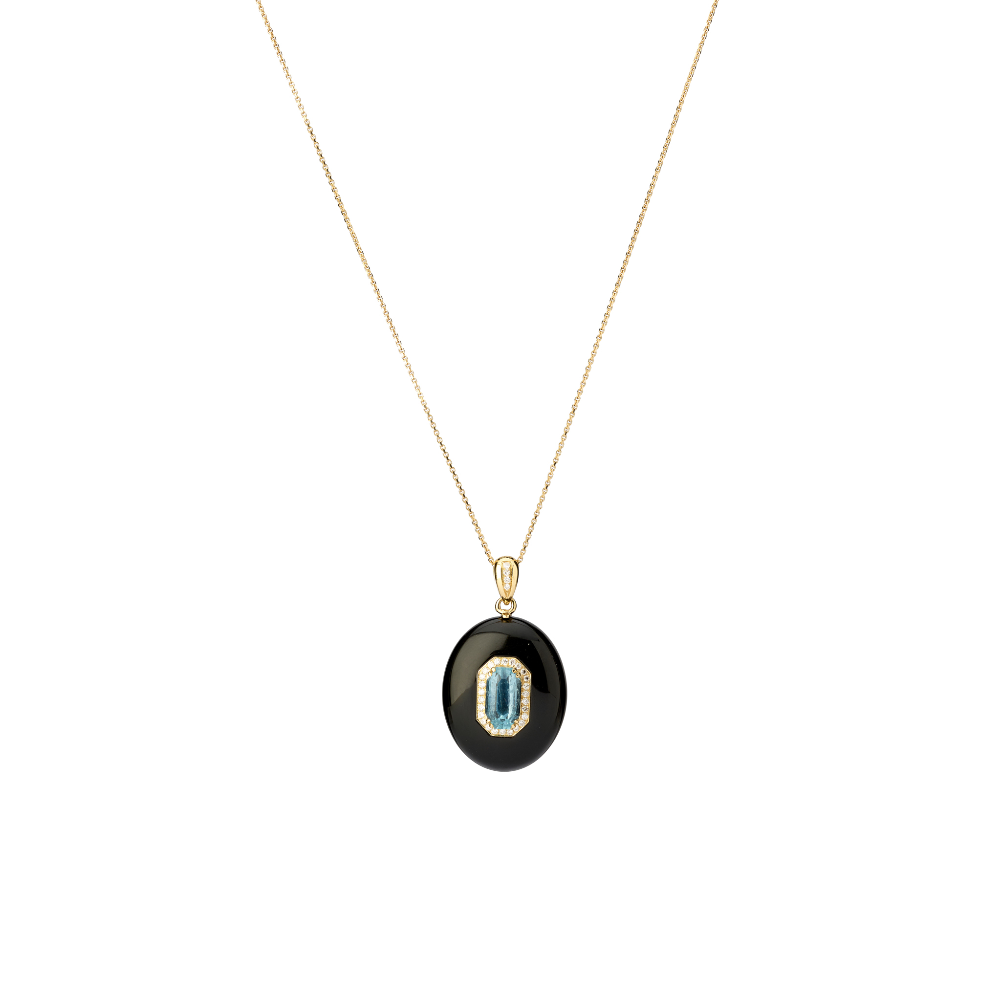 An onyx, aquamarine, and diamond pendant