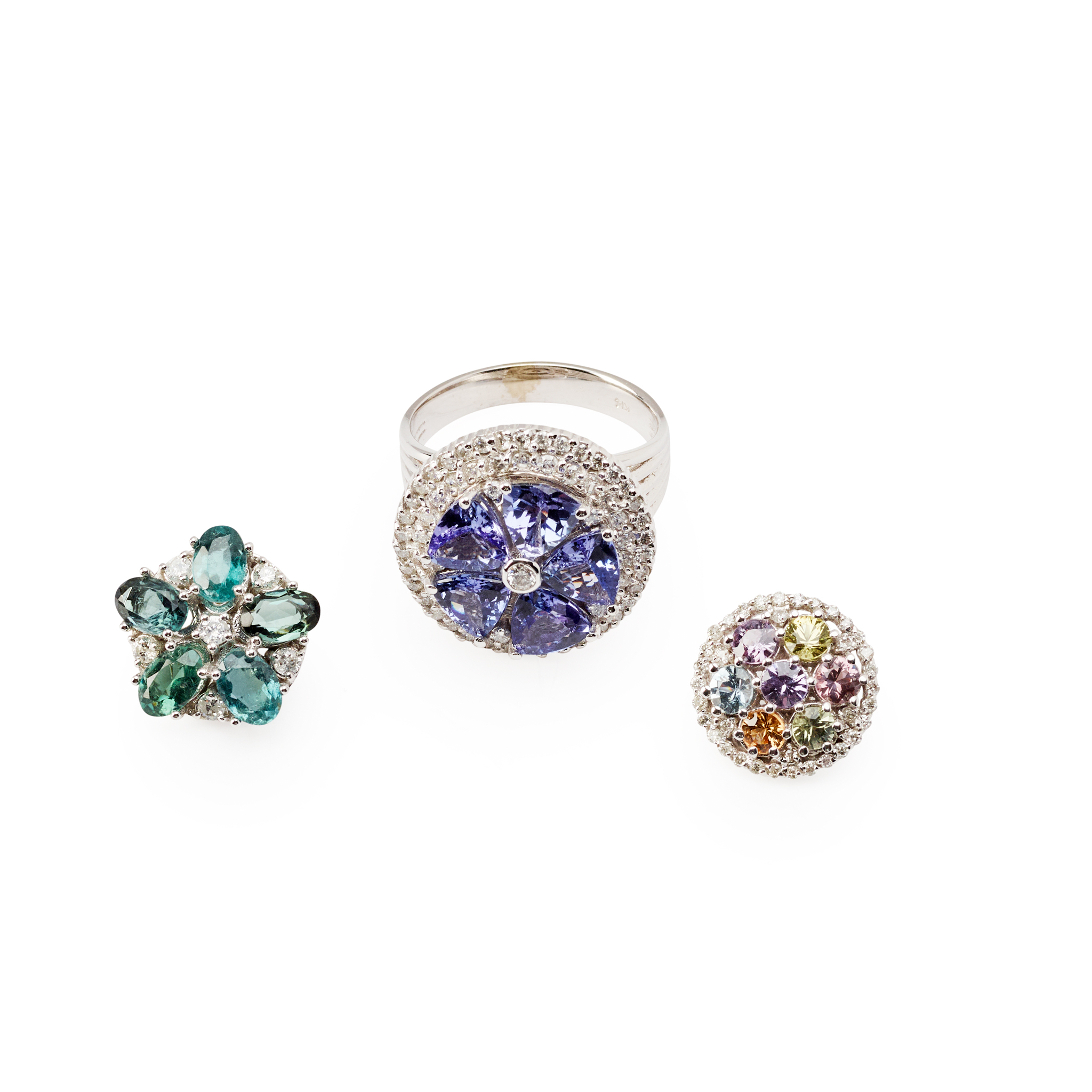Each interchangeable cluster claw-set with diamonds and coloured gemstone clusters, including Tanzanite, tourmaline, topaz etc. the mount with a double border of round brilliant-cut diamonds, split shoulders, stamped 14k