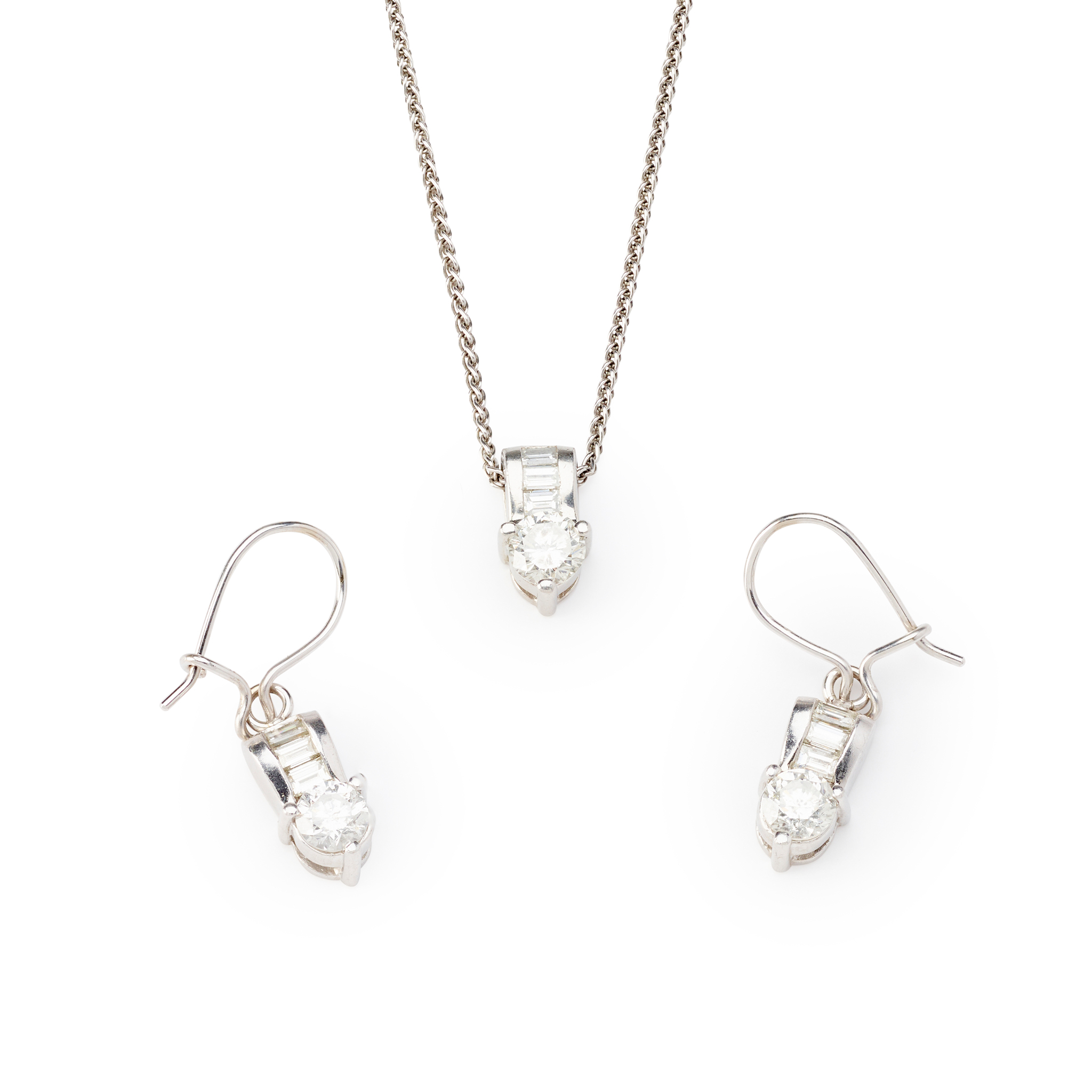 Each claw-set with a round brilliant-cut diamond, below three channel-set baguette-cut diamonds, the pendant to a trace-link chain, hook fittings to earrings, all stamped PLAT (2)