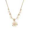 The central of floral and scalloped design set throughout with halved seed pearls, to a flattened circular-link chain, stamped 15; suspending a detachable pendant/brooch, modelled as an eighteen-pointed star, set with halved seed pearls and small old round-cut diamonds, unmarked