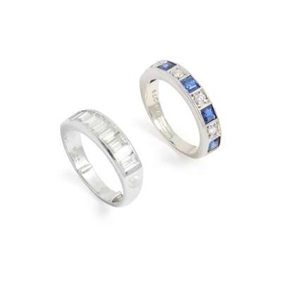 The first channel-set with a single row of baguette-cut diamonds, stamped 750; the second set in 18ct gold with alternating square step-cut sapphires and round brilliant-cut diamonds, plain band, UK hallmark (2)