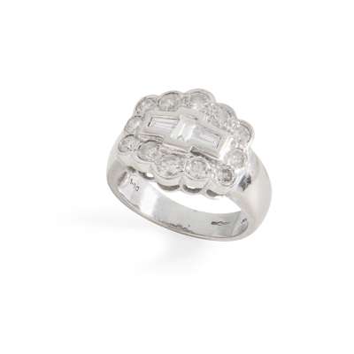 Collet-set with three baguette-cut diamonds in a border of round brilliant-cut diamonds, plain band, UK hallmark