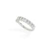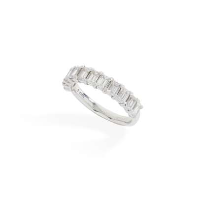 Claw-set with eleven rectangular step-cut diamonds, plain band, UK hallmark