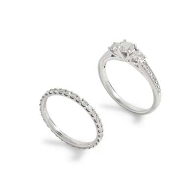 A platinum three-stone diamond ring and matching eternity band