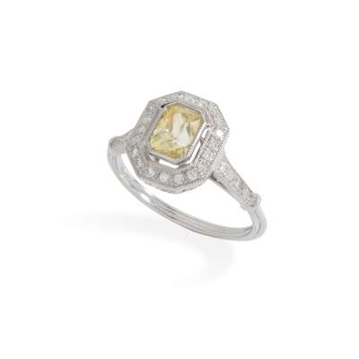 Millegrain-set with a rectangular mixed-cut yellow sapphire, in border of eight-cut diamonds, ribbed detail to band, stamped 850 PLAT