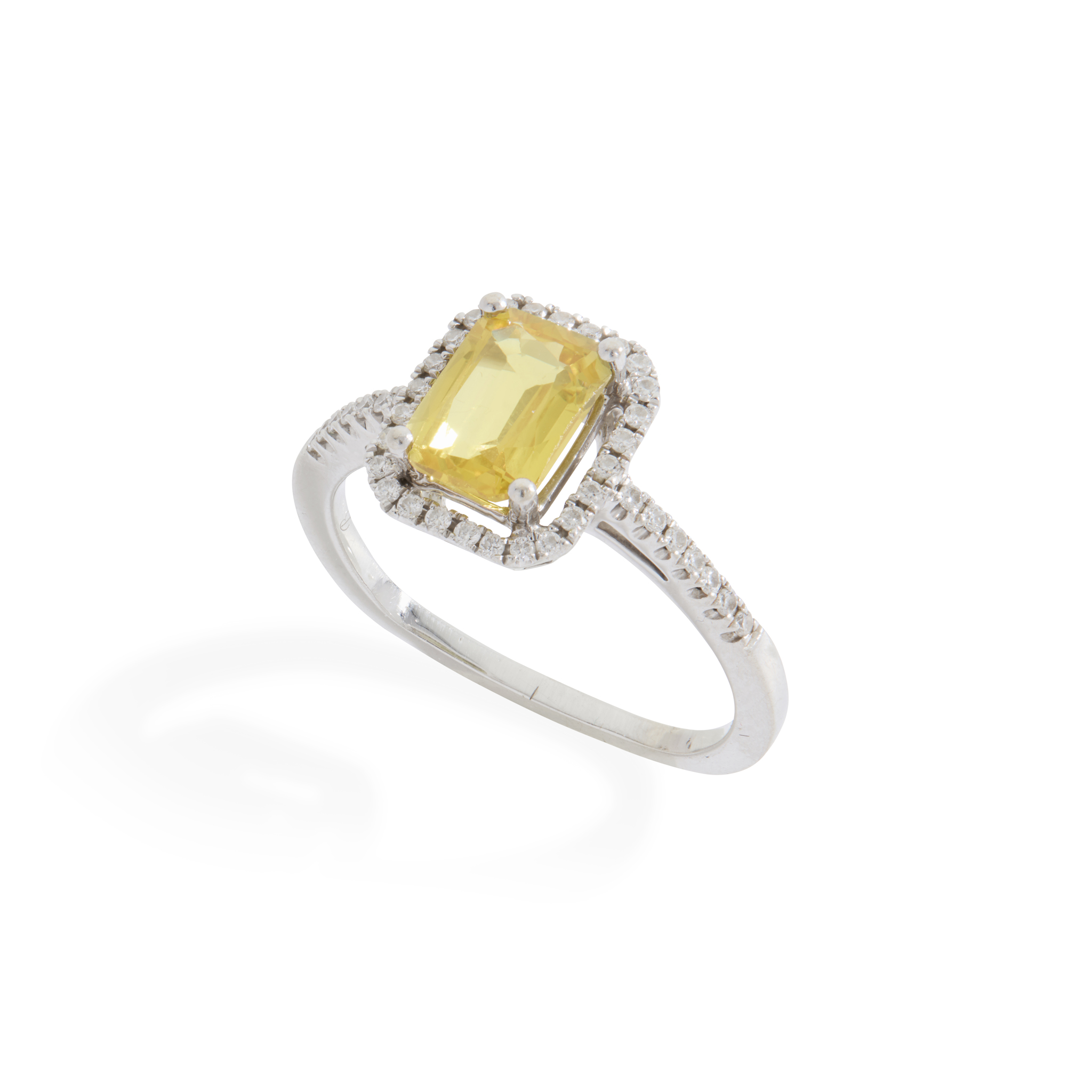 Claw-set with a rectangular mixed-cut yellow sapphire, in a border of round brilliant-cut diamonds, the shoulders also diamond set, plain band, stamped 14k