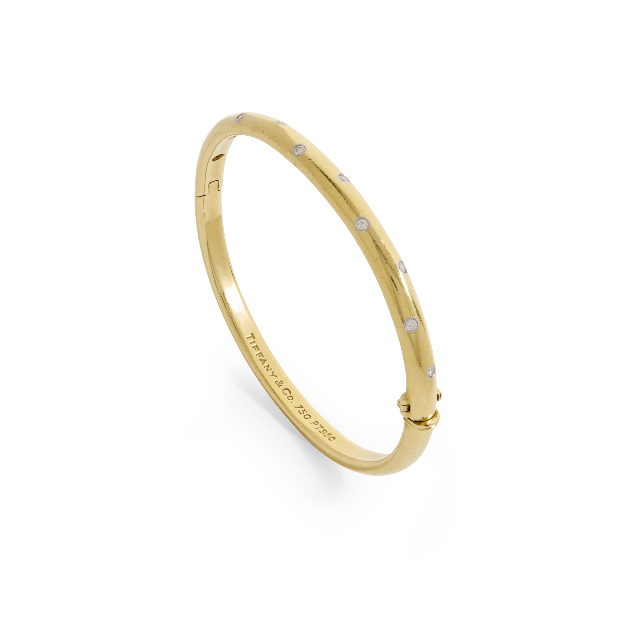 Of hinged design, the front half gypsy-set with ten small round brilliant-cut diamonds, signed Tiffany & Co 750 Pt950