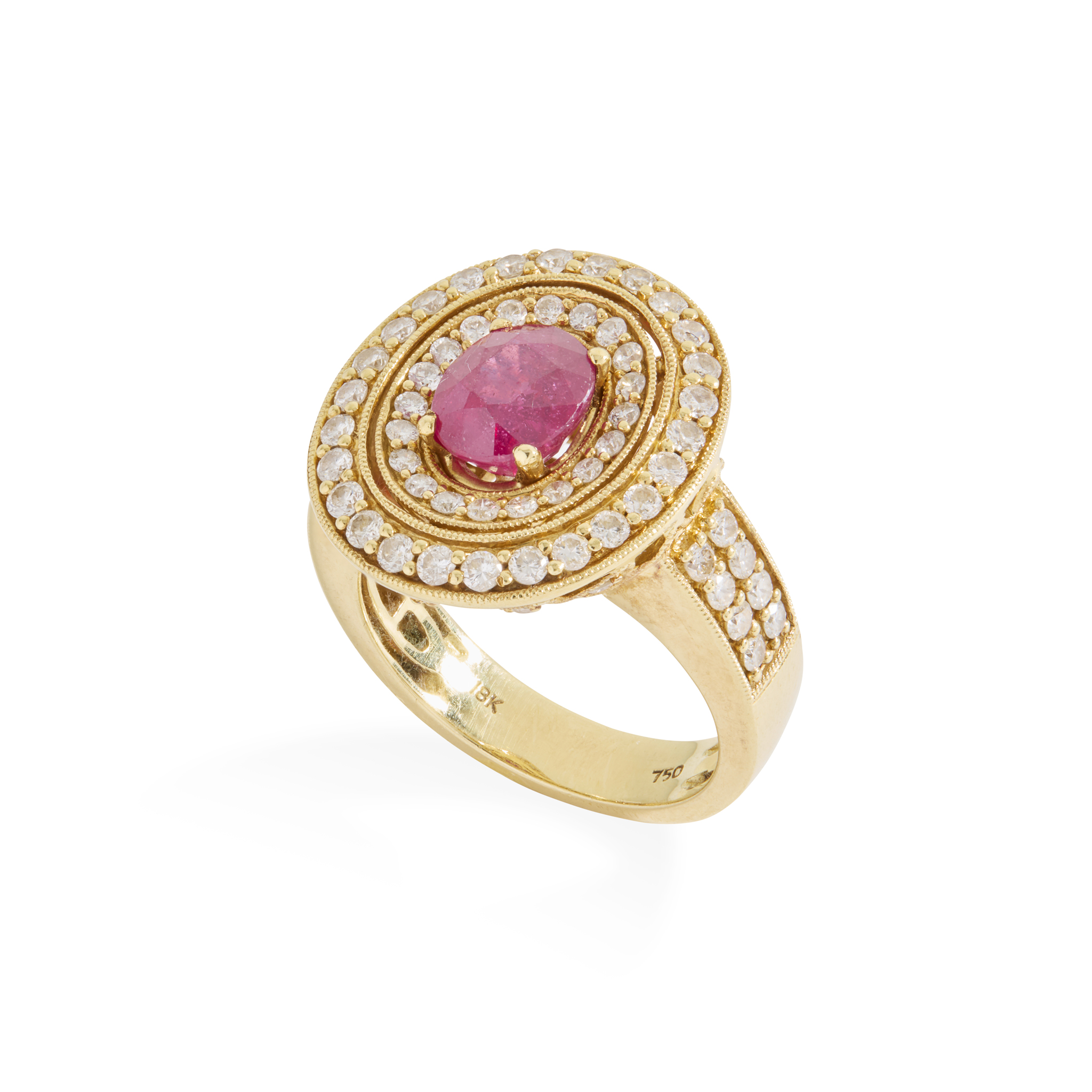 Claw-set with an oval-cut ruby in a double border of round brilliant-cut diamonds, each shoulder set with eight small round brilliant-cut diamonds, plain band, stamped 18K 750