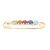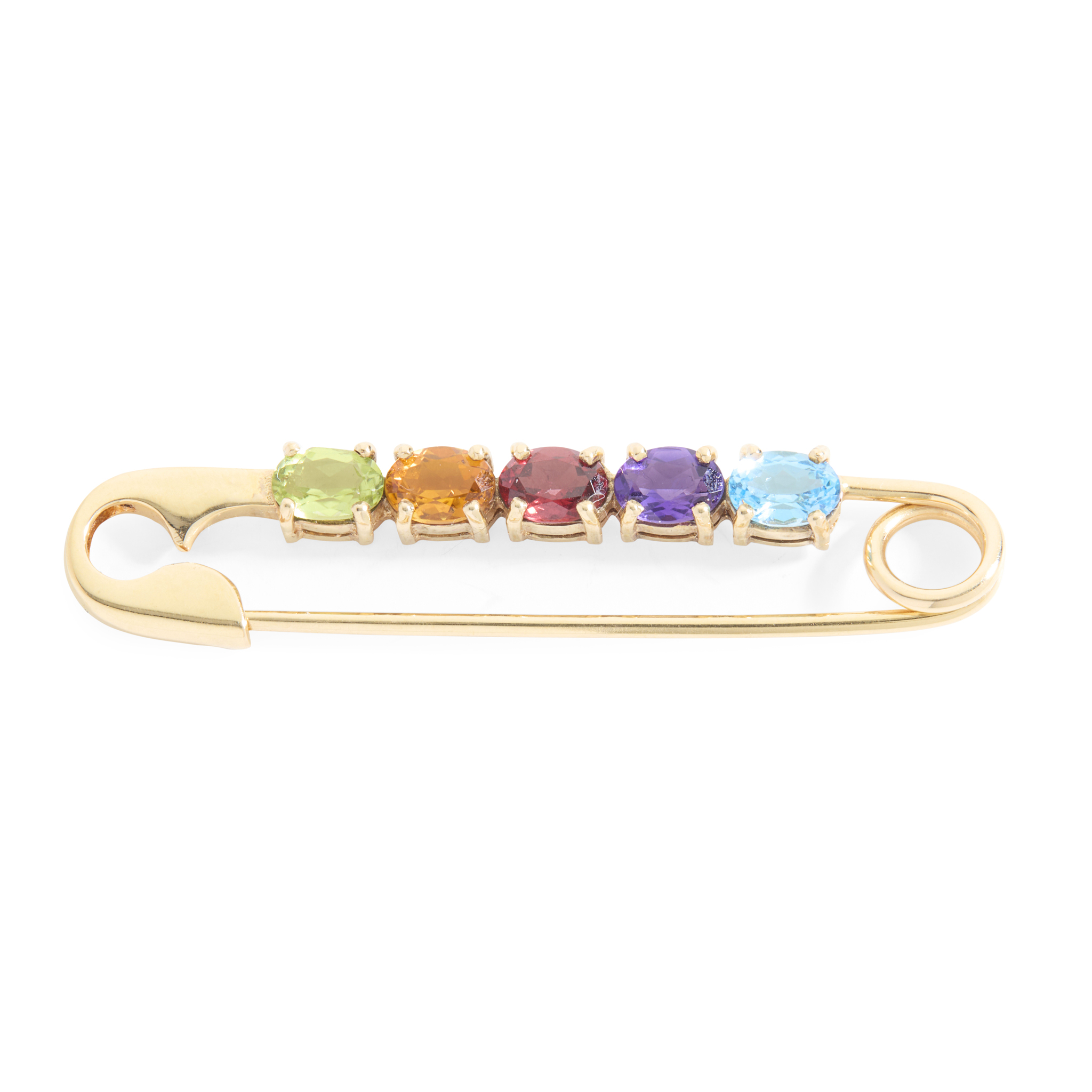 Designed as a safety-pin, claw-set with oval-cut topaz, amethyst, garnet, citrine and peridot, stamped 585
