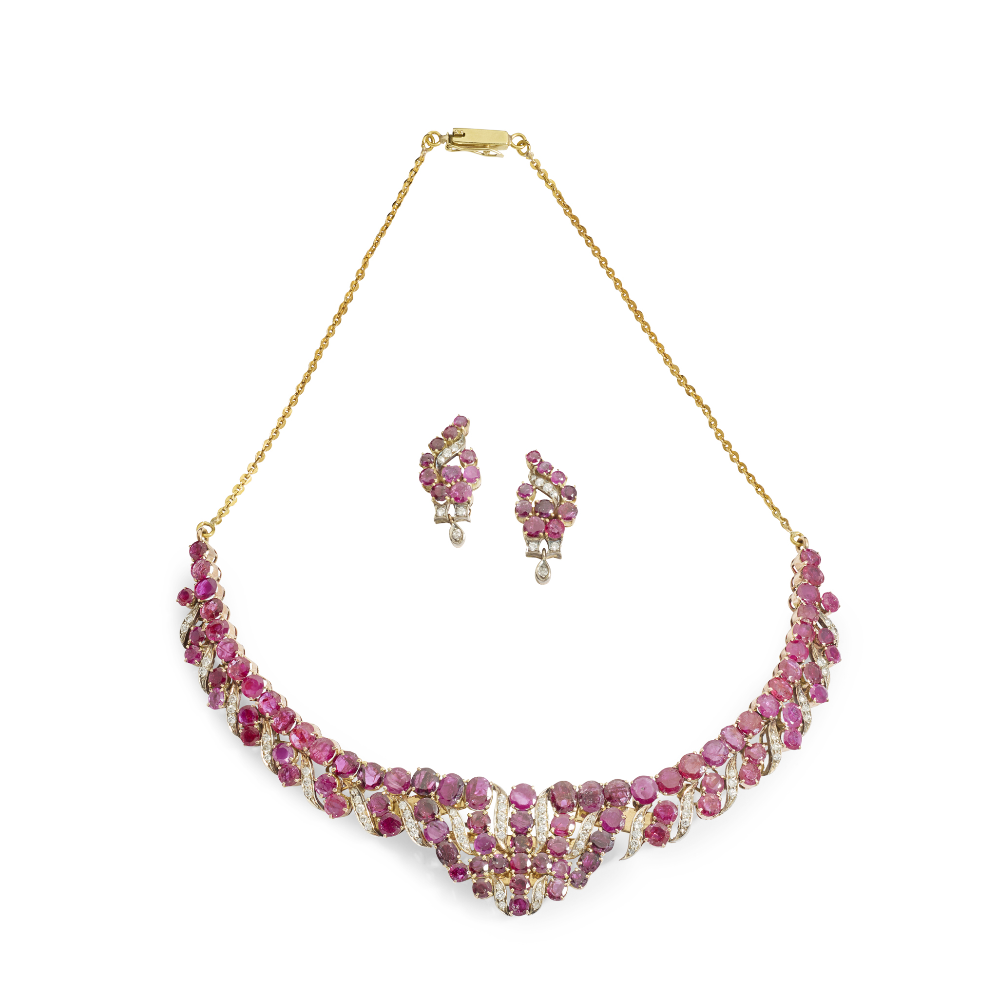 The necklace of tapering design, set throughout with graduated oval and cushion-cut rubies, S-scroll motifs set with small round-cut diamonds, convertible into a brooch and shorter necklace; together with a pair of matching earrings, post and butterfly fittings, both unmarked (2)