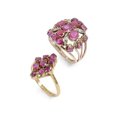 The first of lozenge outline, claw-set with nine round-cut rubies, plain 18ct gold band; the second modelled as a large cluster, set with oval and cushion-cut rubies and small diamond detail, unmarked (2)