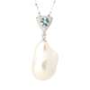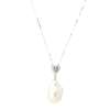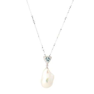Composed of a claw-set trilliant-cut aquamarine in a surround of round brilliant-cut diamonds, suspending a baroque pearl, trace-link chain, stamped Au750