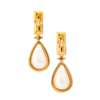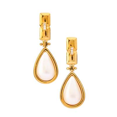 Each collet-set with a drop-shaped mabé pearl, to a rectangular-link surmount set with three small round brilliant-cut diamonds, post and clip fittings, stamped 18k