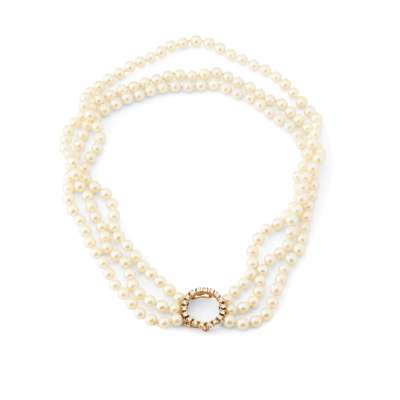 Composed of three strands of cultured pearls, the circular clasp claw-set with round brilliant-cut diamonds, unmarked