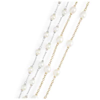 The first set at intervals with cultured pearls to a belcher-link 18ct white gold chain; the second set at intervals with cultured pearls to a 9ct yellow gold chain, both with UK hallmark (2)