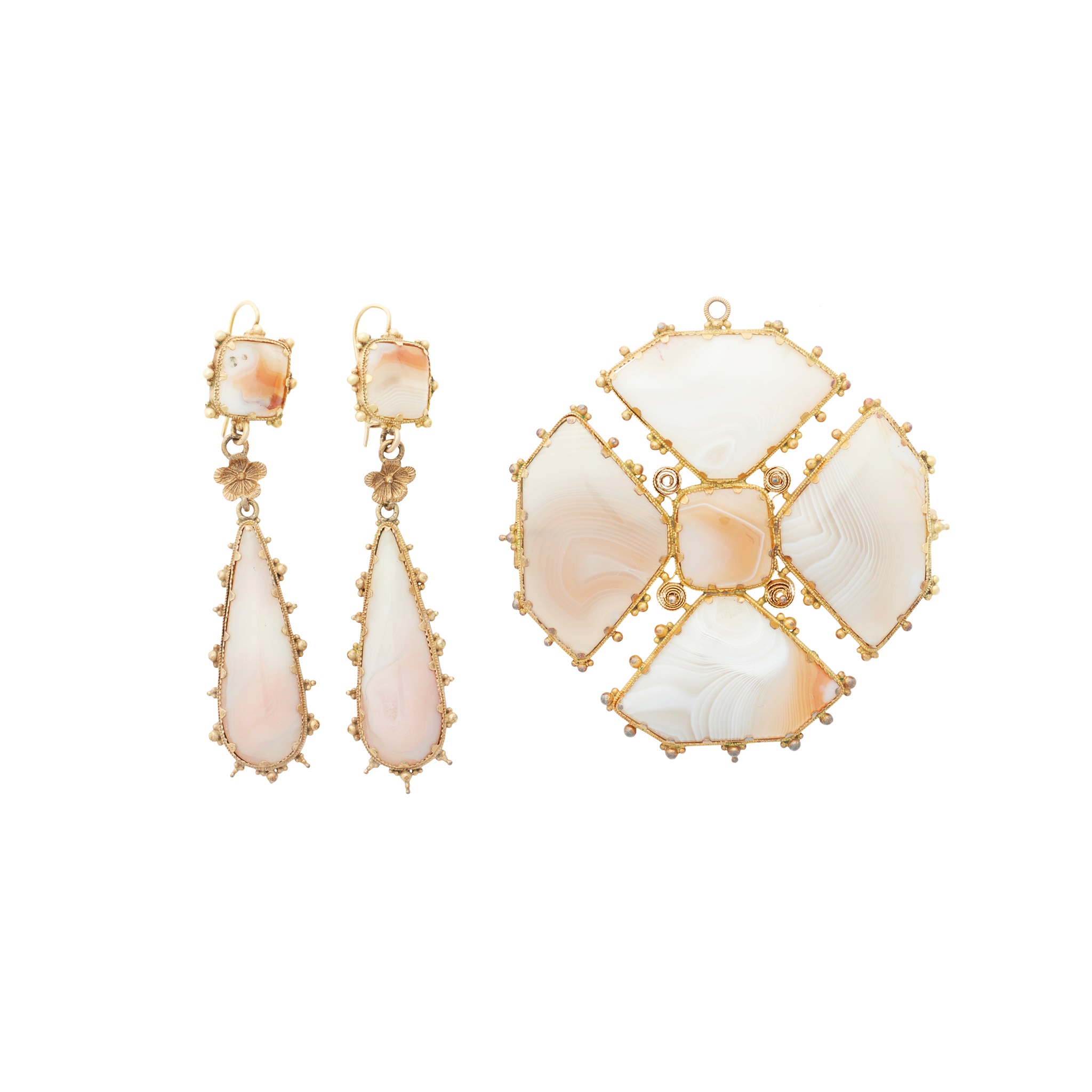 All set throughout with various banded agates, beaded detail to borders, hook fittings to earrings, both unmarked (2)
