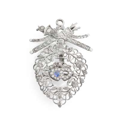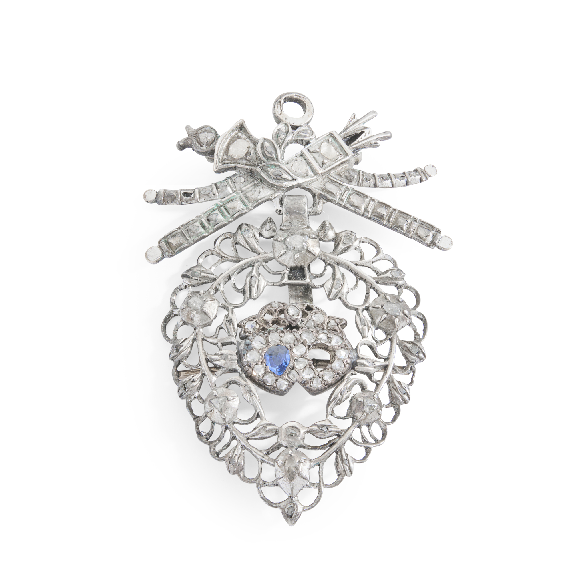 Modelled as a crossed sword and quiver of arrows, suspending a pear-shaped drop with pierced detail and central heart-shaped motifs, set throughout with rose-cut diamonds and a pear-shaped sapphire (one deficient), unmarked