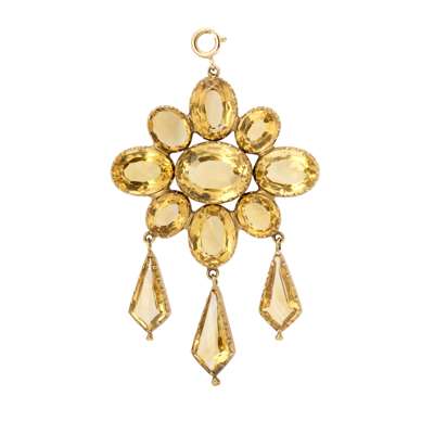 Set with a cluster of nine graduated oval-cut citrines, suspending three kite-shaped citrine drops, unmarked