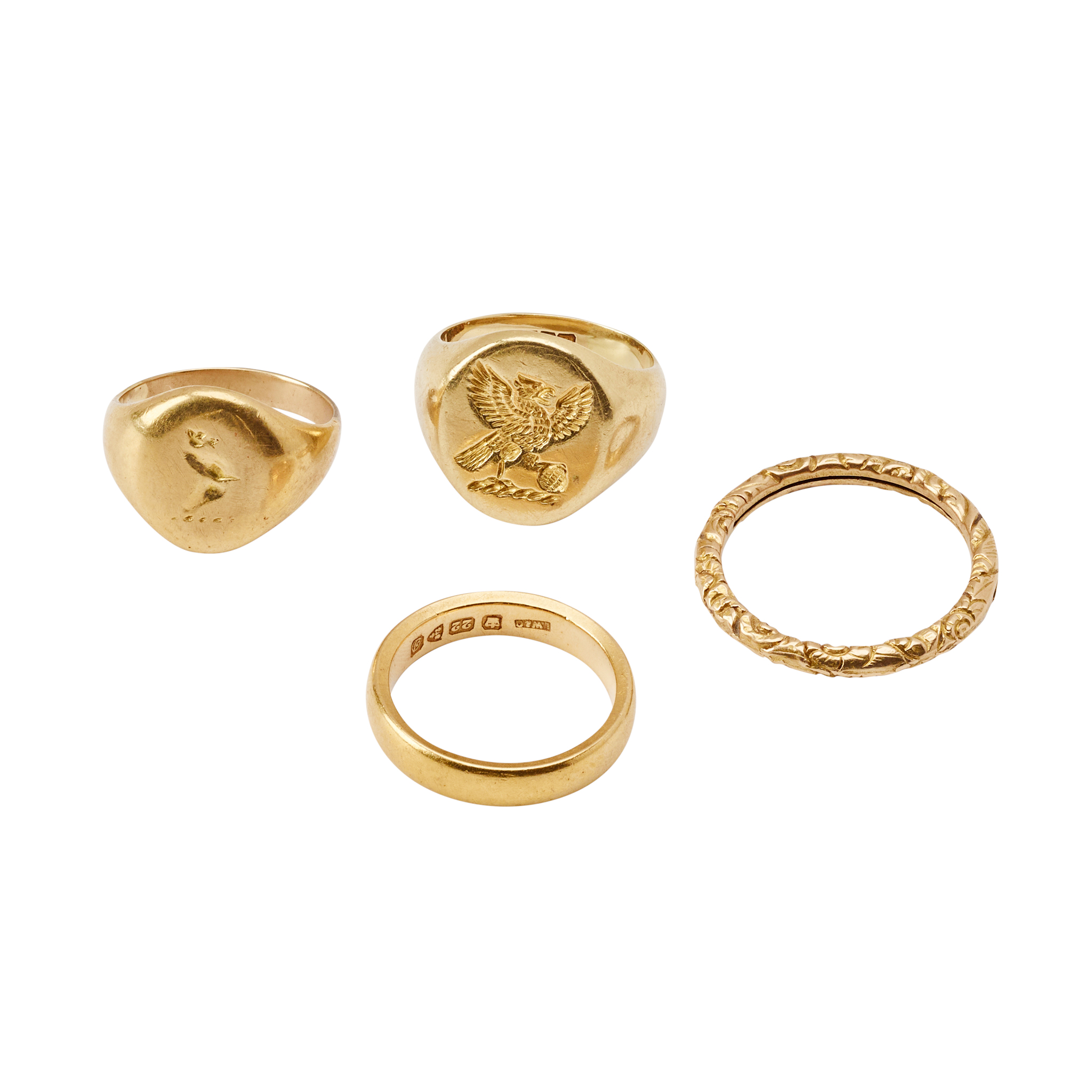 Including an 18ct gold signet ring, a 22ct gold wedding band; another signet ring, unmarked; and an unmarked locket mount (4)