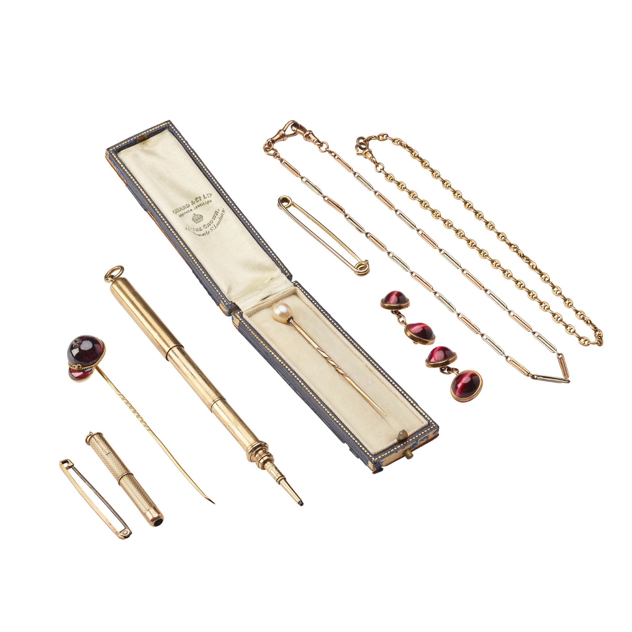 Including a 9ct gold bi-coloured watch chain, another fancy-link chain, unmarked; a garnet and diamond jockey’s hat tie pin, unmarked; a 9ct gold tooth pick, a pair of 9ct gold and red-gem cufflinks; and two 9ct gold safety pins; a circular pearl and gem set brooch, a 9ct gold propelling pencil and a pearl stick-pin (9)