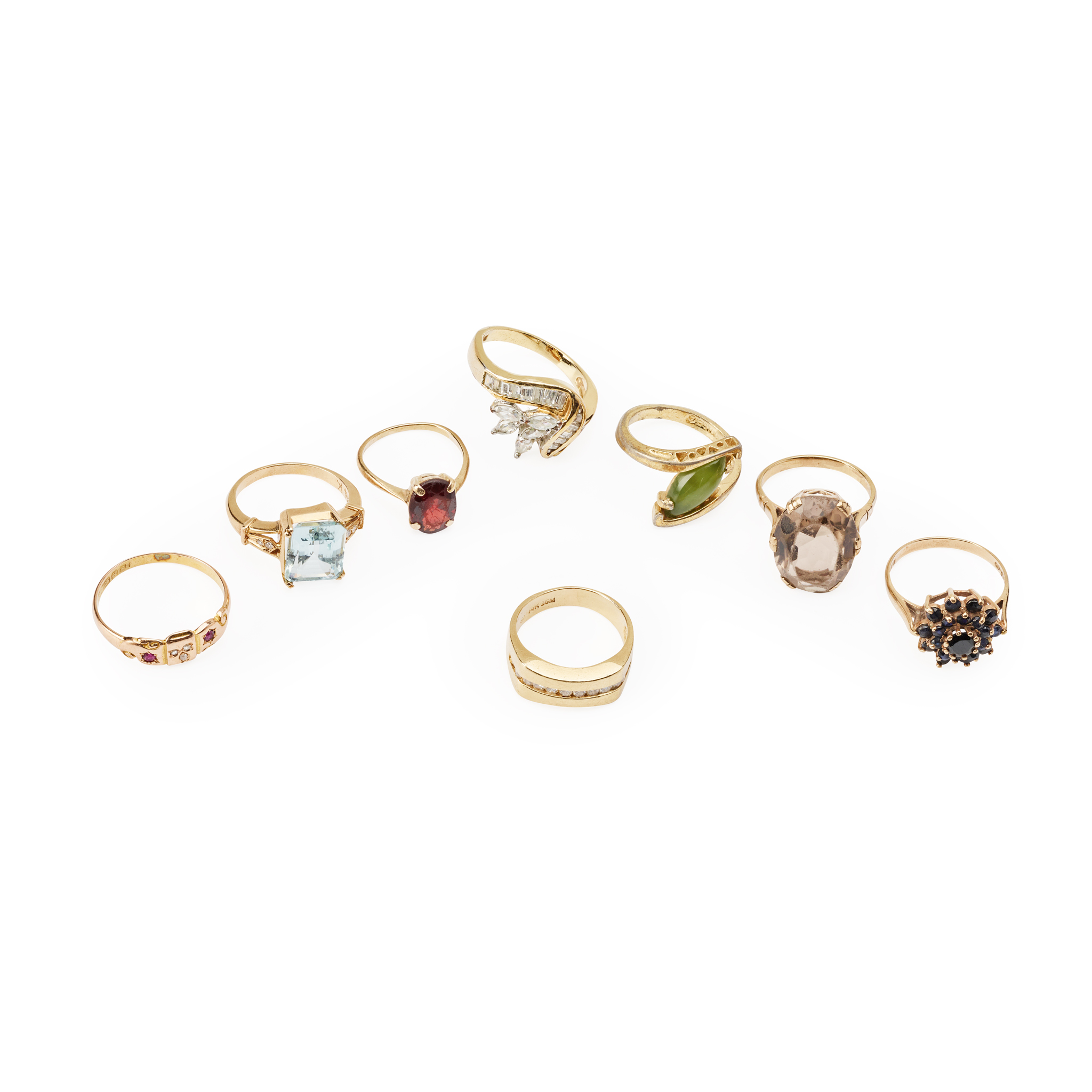 Including a 9ct gold sapphire cluster ring, a 15ct gold ruby and diamond ring; a marquise and baguette-cut diamond ring, stamped 18k; a jadeite ring, stamped 18k; a channel-set diamond ring, stamped 14k; a smokey quartz ring, stamped 9ct, and aquamarine and diamond ring, stamped 14k; and a garnet ring, unmarked (8)