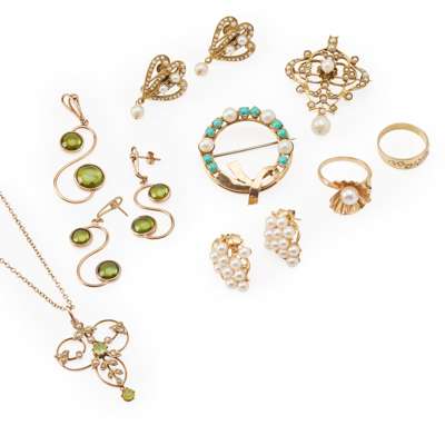 Including a cultured pearl brooch and matching earrings, stamped 14k; a pearl and turquoise brooch, unmarked; a pair of cultured pearl earrings, stamped 14k; and Edwardian pearl and peridot pendant, unmarked; a pearl and diamond ring, unmarked; a cultured pearl ring, indistinctly marked; a pair of peridot scrolling earrings and matching earrings, unmarked (9)