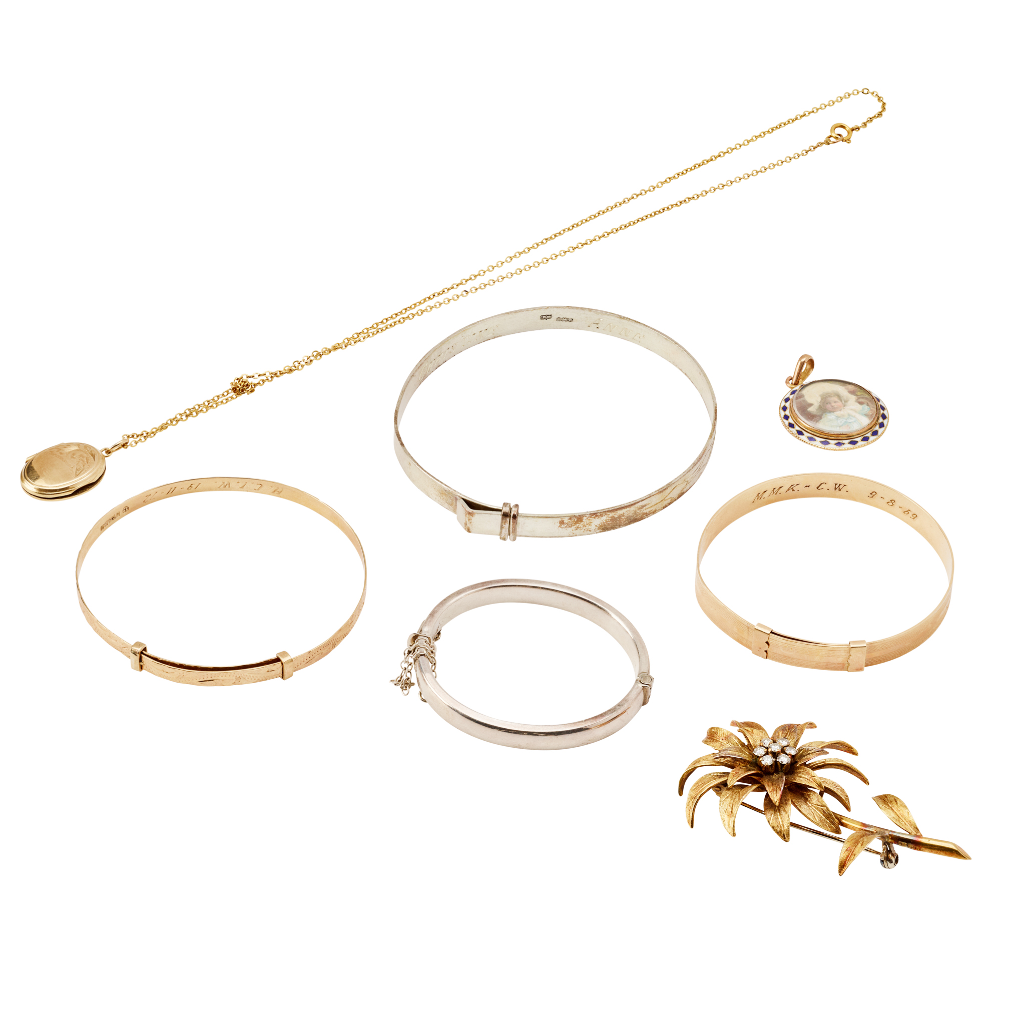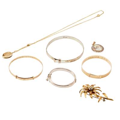 Including a floral brooch set with seven small round brilliant-cut diamonds, stamped 18KT; a 9ct gold christening bracelet, a smaller rolled gold example, and a two further silver examples; a circular enamelled portrait pendant, stamped 9ct, and a gold plated pendant locket (8)