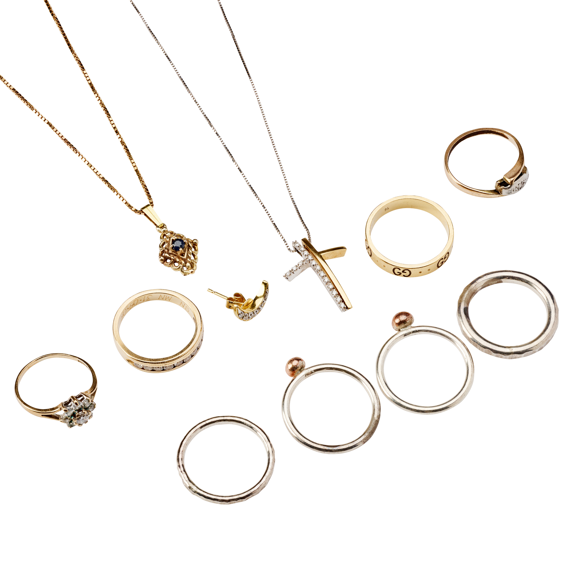 Including an 18ct gold Gucci ring, a diamond half-eternity ring, stamped 14k; two diamond rings, unmarked; a diamond cross pendant and trace-link chain, stamped 750; a 9ct gold sapphire pendant and trace-link chain; a single diamond crescent earring, unmarked; and a contemporary four-part ring set (11)