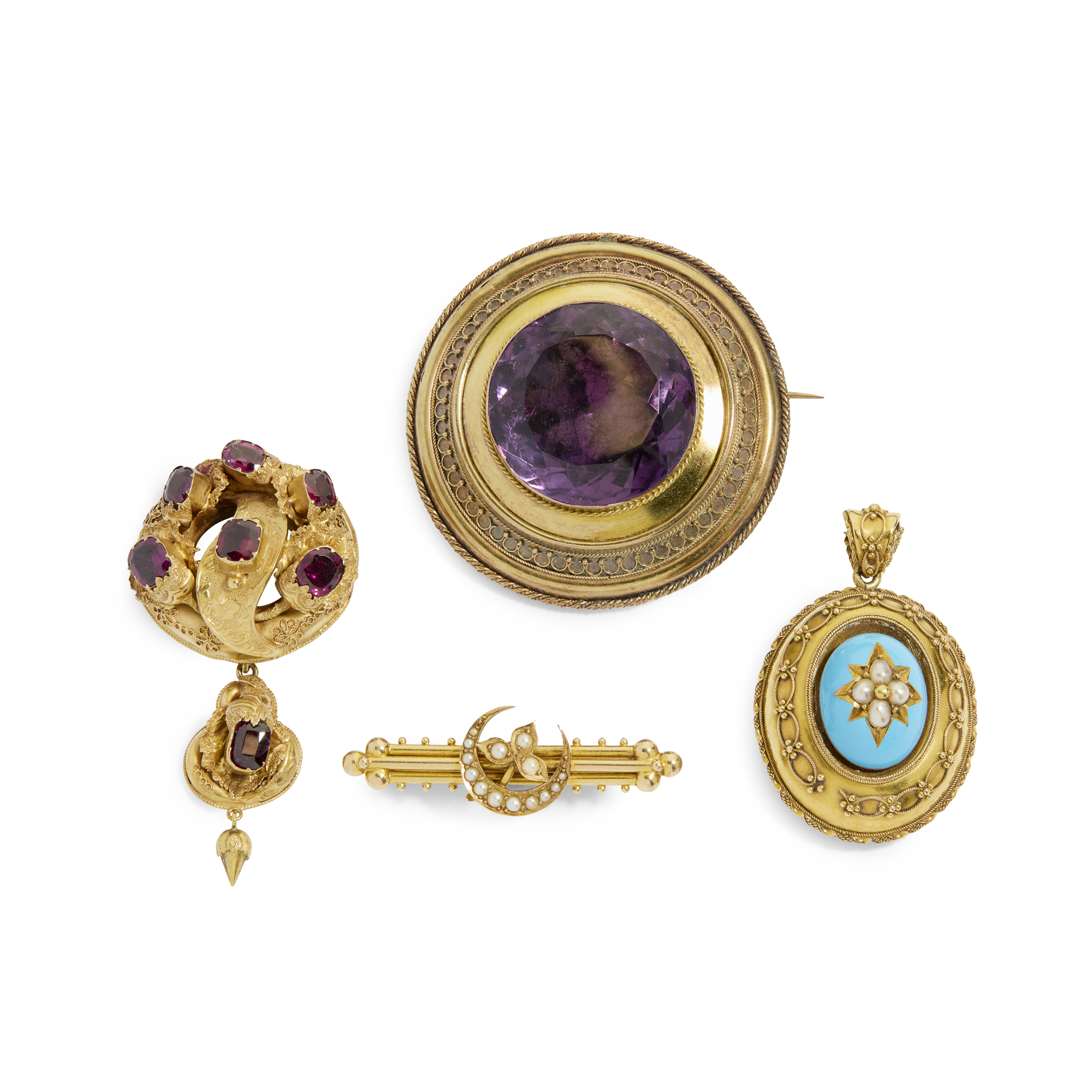 Including a seed pearl crescent and bar brooch, stamped 9ct; a blue enamel and pearl pendant, unmarked; a garnet brooch, unmarked; and a large amethyst brooch (4)