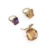 Including and amethyst and ruby cocktail ring, stamped 14k; a citrine and green gem ring, stamped 14k; a large citrine pendant in a stylised scrolling mount, unmarked (3)