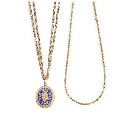 Formed as a double chain suspending an oval locket with blue enamel detail, unmarked; together with a fancy-link chain with blue enamel detail, unmarked (2)