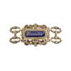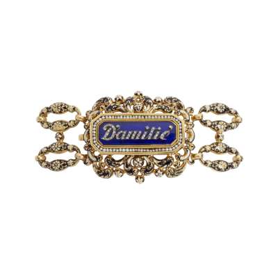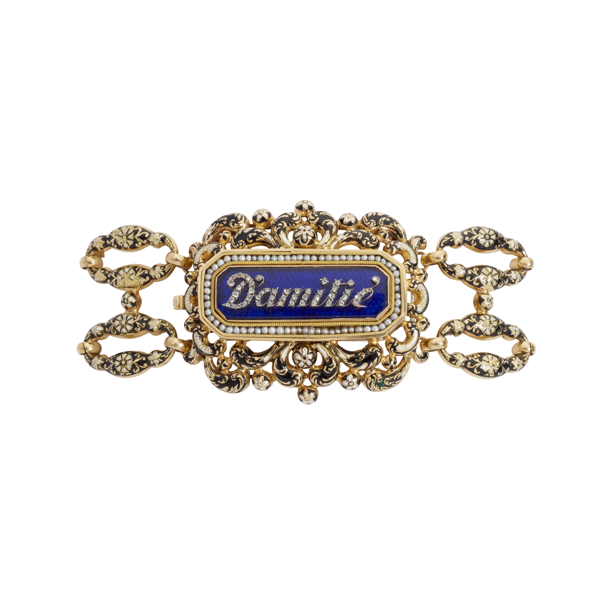 Composed of a central blue enamel panel with onset ‘D’amitie’ in rose-cut diamonds, in a border of seed pearls with black and white enamel scroll detail, to oval links with similar enamel detail, unmarked
