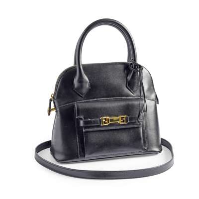 Detachable long shoulder strap, gold metal hardware, front pocket with double logo clasp, loose padlock and dustbag