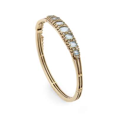 Of hinged design, the front set with seven graduated oval-cut aquamarines and pairs of small eight-cut diamonds, unmarked