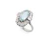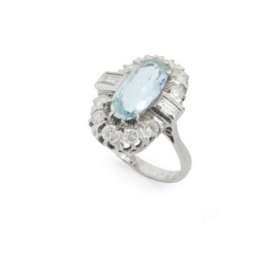 Claw-set with an oval-cut aquamarine, in a border of round brilliant and baguette-cut diamonds, plain band, stamped 18ct