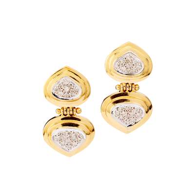 Each modelled as two pear-shaped panels, pavé-set with round brilliant-cut diamonds in a stepped border, post and clip fittings, unmarked